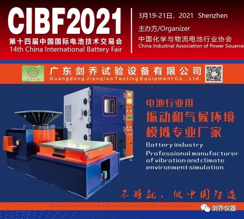 (CIBF2021)“第十四屆中國國際電池技術交流會/展覽會” 展覽面積99000平方米,展位數量達5000+個,預計參展商1300+家。CIBF2021展覽會將集中展示全球動力電池、儲能電池、3C電池、各種電池材料、制造設備、動力及儲能系統解決方案,不僅展示近兩年來我國在各種乘用車、新能源客車及物流車用動力電池領域和新能源儲能領域的一系列成果,也是各動力電池生產企業和整車制造企業了解動力電池最新測試、開發和驗證技術的理想場合,在此【劍喬儀器】誠摯邀請您蒞臨參觀指導!
