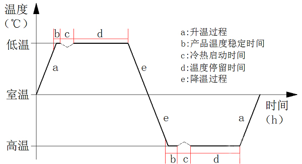 熱循環(huán)試驗是一種利用高低溫交變濕熱試驗箱對試驗產(chǎn)品進行的預設高低溫交替的應力考核,用以驗證材料和產(chǎn)品是否達到在研發(fā)、設計、制造中預期的質(zhì)量目標的一類可靠性試驗。通過大溫變速率可暴露產(chǎn)品潛在的材料與性能缺陷,經(jīng)過不斷地質(zhì)量改進,達到可靠性提升的目的。航天單機類產(chǎn)品一次熱循環(huán)示意圖見下圖1所示。