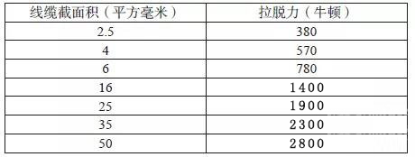 2.1.1 端子至線纜的拔出力:該測試是為了確保線束在車輛裝配過程及后續(xù)使用產(chǎn)生的作用力不會(huì)使線纜脫出端子,從而造成產(chǎn)品失效。該測試與供應(yīng)商的壓接參數(shù)和線纜接插件匹配度有高度相關(guān)性。具體力學(xué)性能要求見表1。